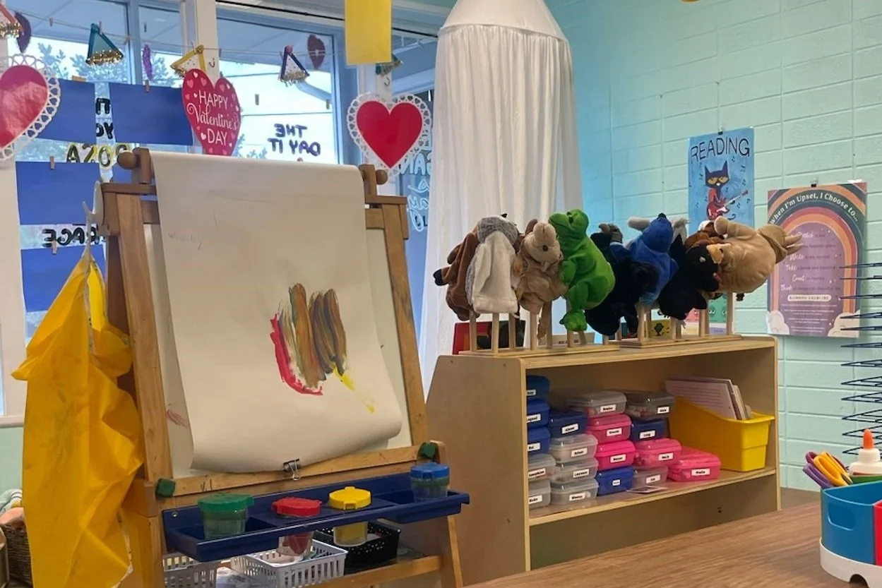 In our preschool, the literacy center is the first center you will see when you enter the room. It is what we call a “quiet center” because the children are quietly looking at books, having a book read to them by a teacher, listening to a story from the Tonies Box, using the felt board to act out stories or acting out a story with the finger or hand puppets. We also utilize technology by using a speaker that reads a book through Audible. The child looks at the book as it is read to them. In this center, preschoolers develop lots of print concepts like where the front of a book is located. They learn what an author does as well as what an illustrator does for a book. The children are exposed to both fiction and non-fiction books. They learn to recognize letters and later on they recognize words. They learn that sentences are made up of words and start to understand the basic pre-reading skills kids need when they go to elementary schools.