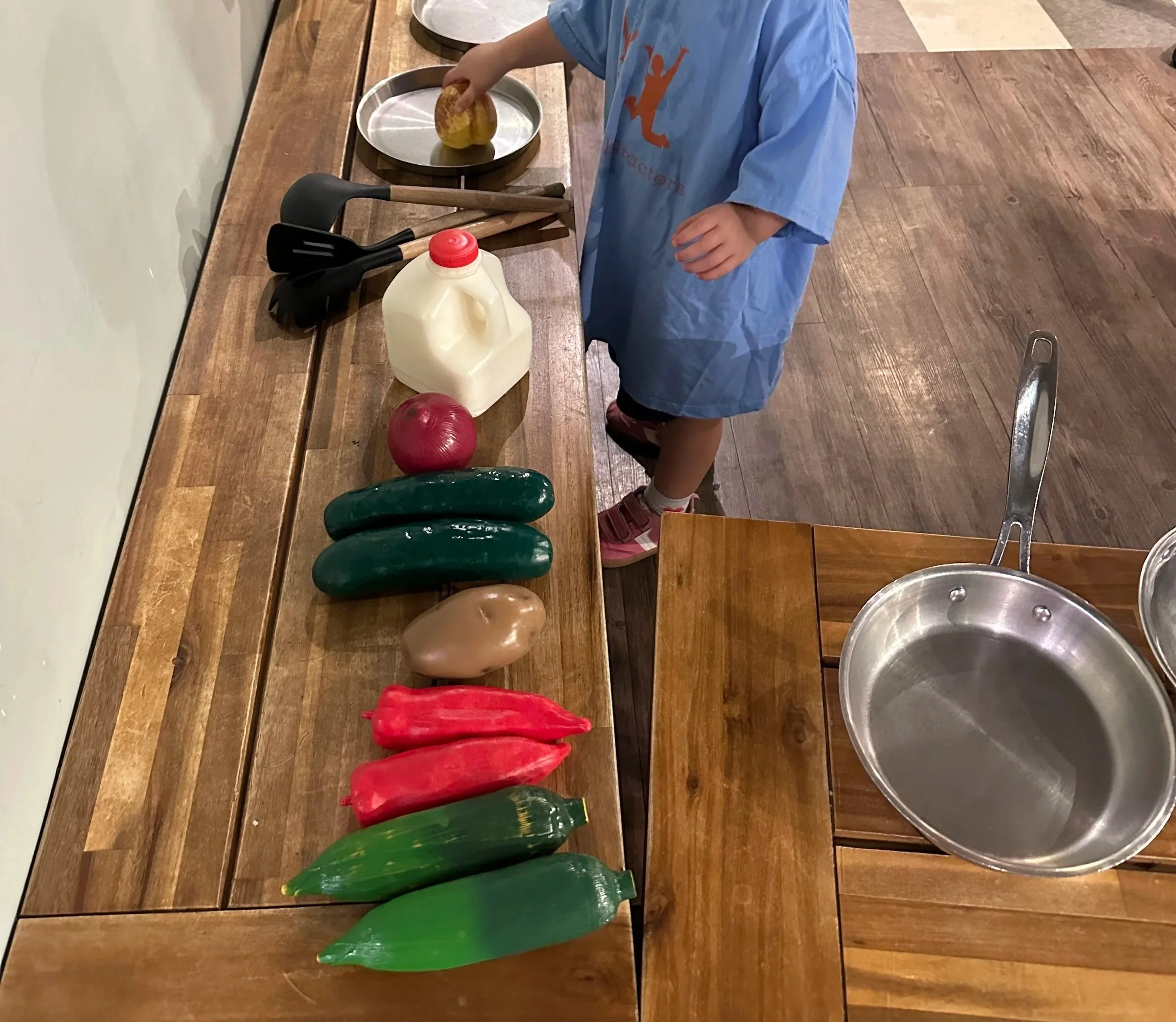 In our classroom we have a dedicated dramatic play center in which the preschoolers can go to numerous times of the day. It has a kitchen set, food from many different cultures, dolls for dressing, rocking and feeding and dress up clothes for kids to wear. It is situated on the side of the room where the louder centers are like blocks, science and table toys. Every two weeks we have a section of the dramatic play area that we change out to coincide with our thematic units that we are studying and the time of year. At any given time, you may see a fire station set, a grocery store or even a campground. We have an extensive collection of units that the kids love to explore! It sparks their curiosity and imagination which is what we want to happen. It helps them develop language skills by talking with their friends while pretending to be firefighters, moms and dads, chefs and so much more. It develops problem solving skills when they have to work out social situations like sharing the toys, use kind words and saying what their friends did that upset them. They learn math concepts like same and different, patterning, sets of items, sorting and classifying simply by setting a small table for dinner for two friends. We immerse ourselves in social studies by making sure there are play foods from different cultures as well as play clothes to dress up in from other cultures. We also try to extend the learning by making sure our dramatic play area reflects any field trips we may be taking.