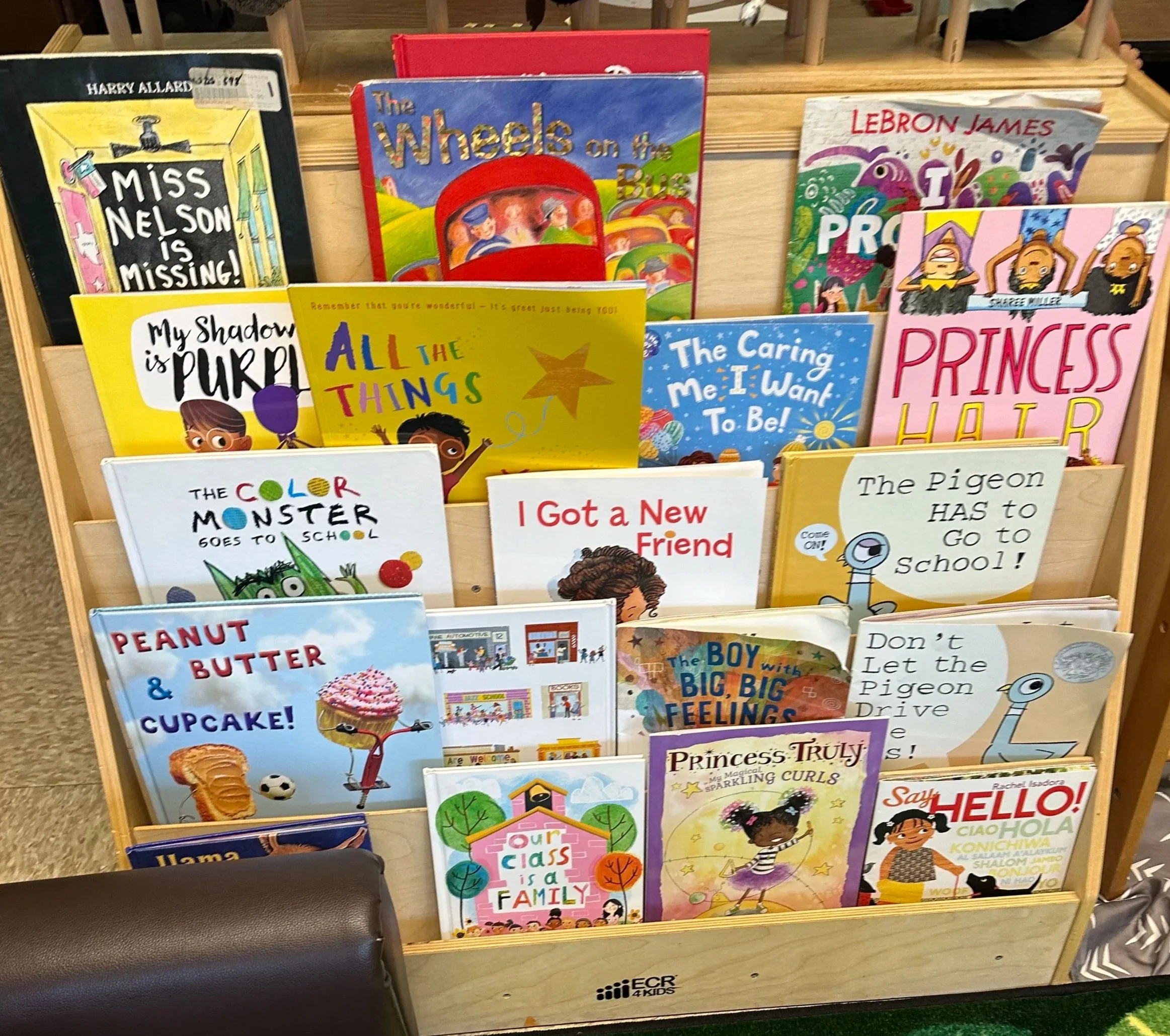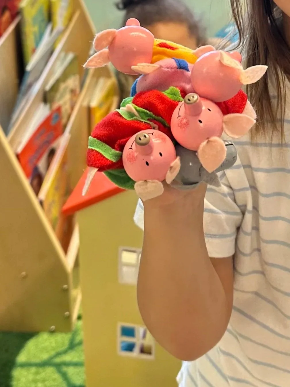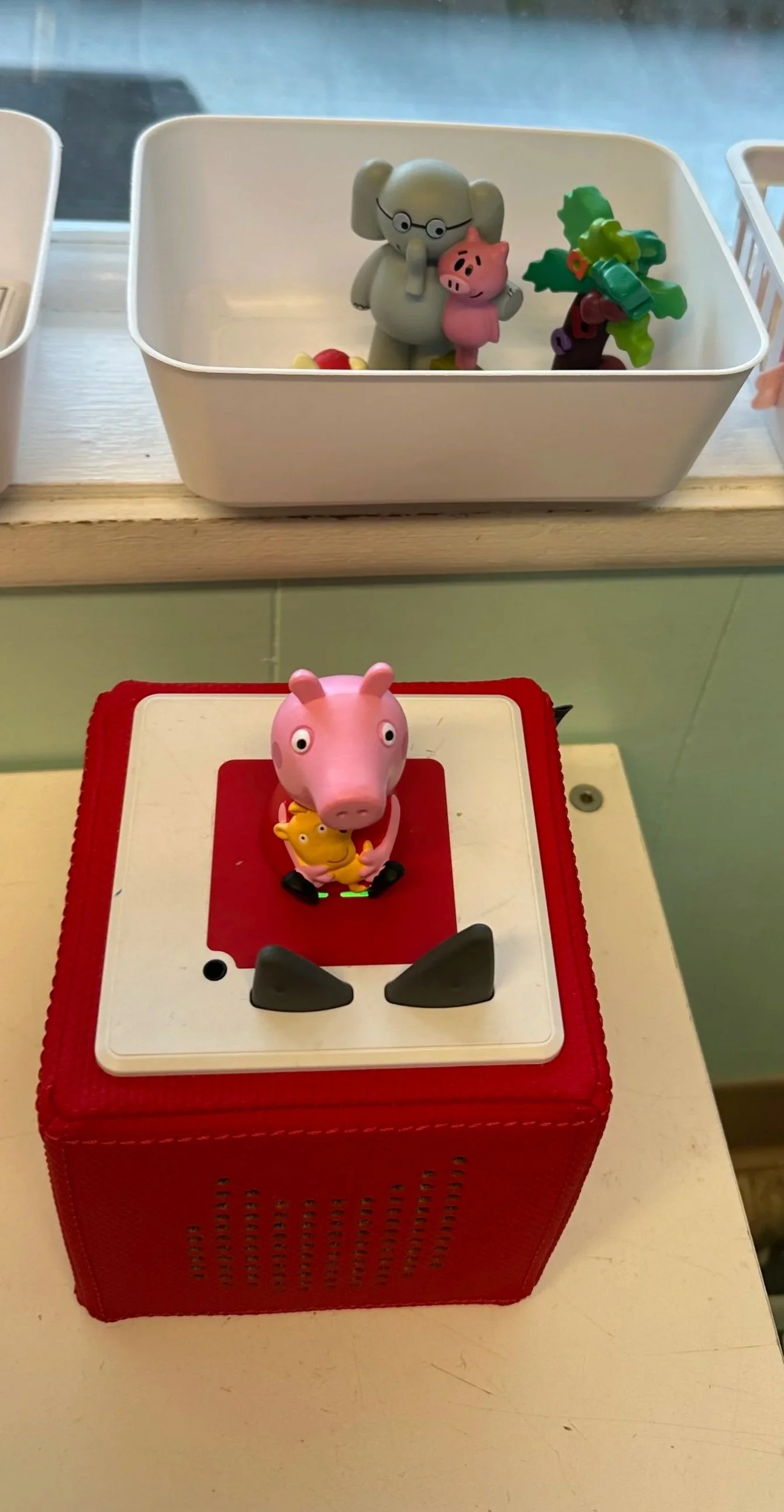 We make sure to rotate our books in the area so that they are relevant to the theme in the room for that week. A good example of this was our back-to-school theme for the first two weeks. We had a large variety of back to school books like “Twas the Night Before Preschool” for them to look and listen to on Audible. We use a Tonies Box and the figurine characters you can buy to keep the children engaged and eager to be in the area. The figurines sing songs with them, read stories to them and much more. They are engaging the child without the screen. Instead, the children can follow along as the book is read to them by the character in the book. For our “3 Little Pigs” theme week we used the figurines Elephant and Piggie as well as Peppa Pig. We also got out the Peppa Pig house and furnishings. This allowed the children to listen to the Peppa Pig character read books from the Peppa Pig series. This helps reinforce print concepts that children develop from 3-5 years old. This includes things like reading left to right, starting in the upper left-hand corner to lower right-hand corner of a page and letter recognition just to name a few.